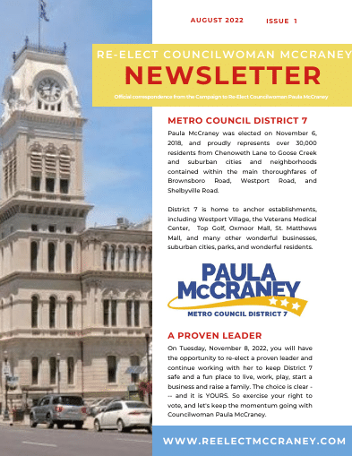 Councilwoman McCraney stays in touch with constituents through neighborhood meetings and newsletters. Plus, she is always just a phone call or email away, and encourages neighbors to contact her
